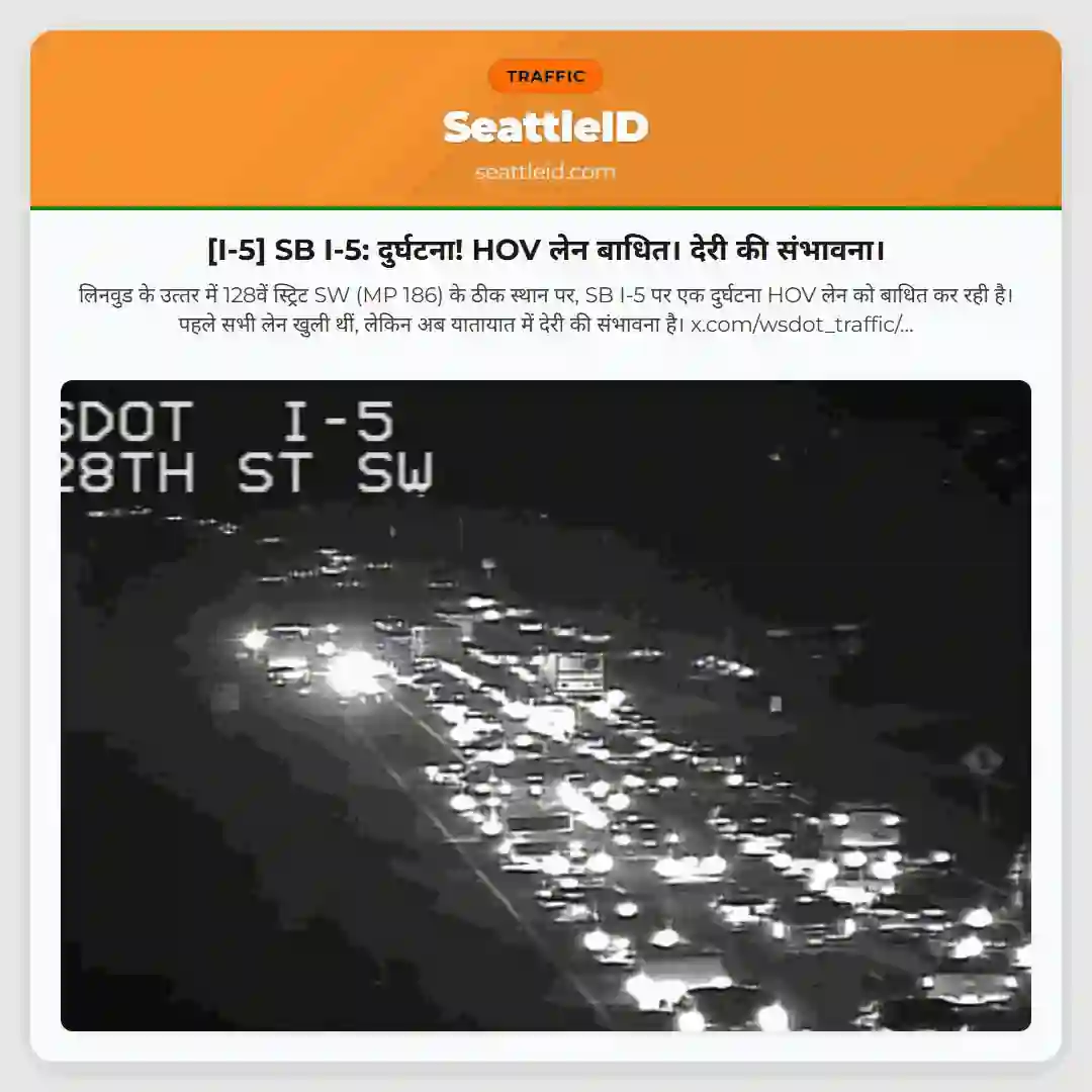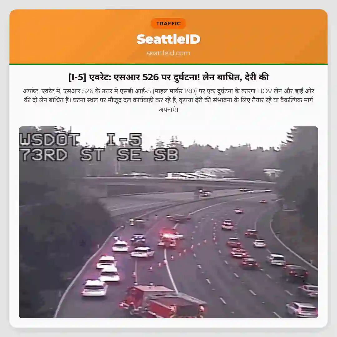 मि Michigan St (MP 161) पर I-5 दक्षिण की ओर जाने वाले रैंप पर टक्कर हो गई है, जिससे रैंप आंशिक रूप से अवरुद्ध है। वाहन चालकों से सावधानी बरतने का अनुरोध है।
