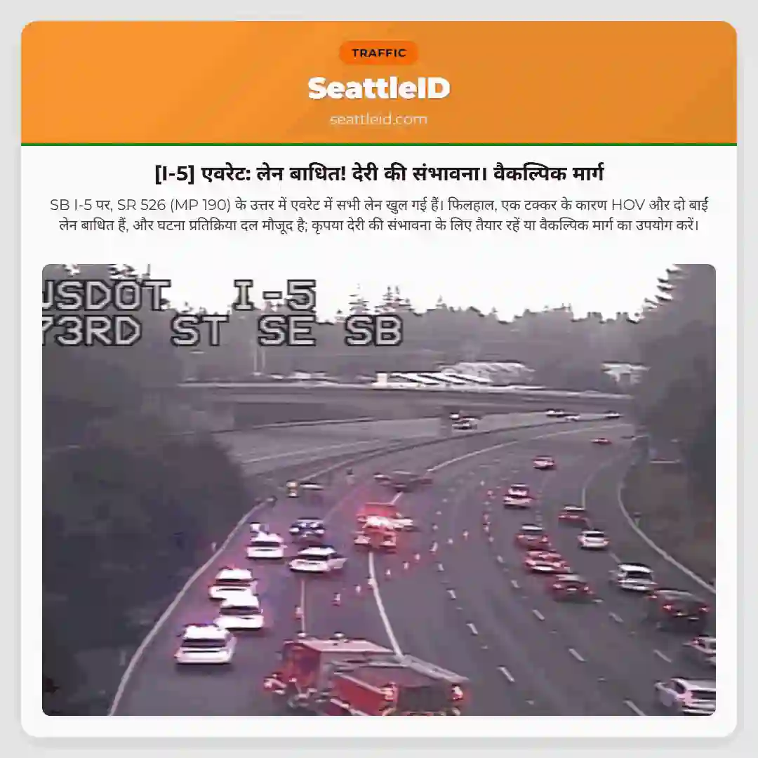 I-5 पर दुर्घटना! लेन अवरुद्ध।