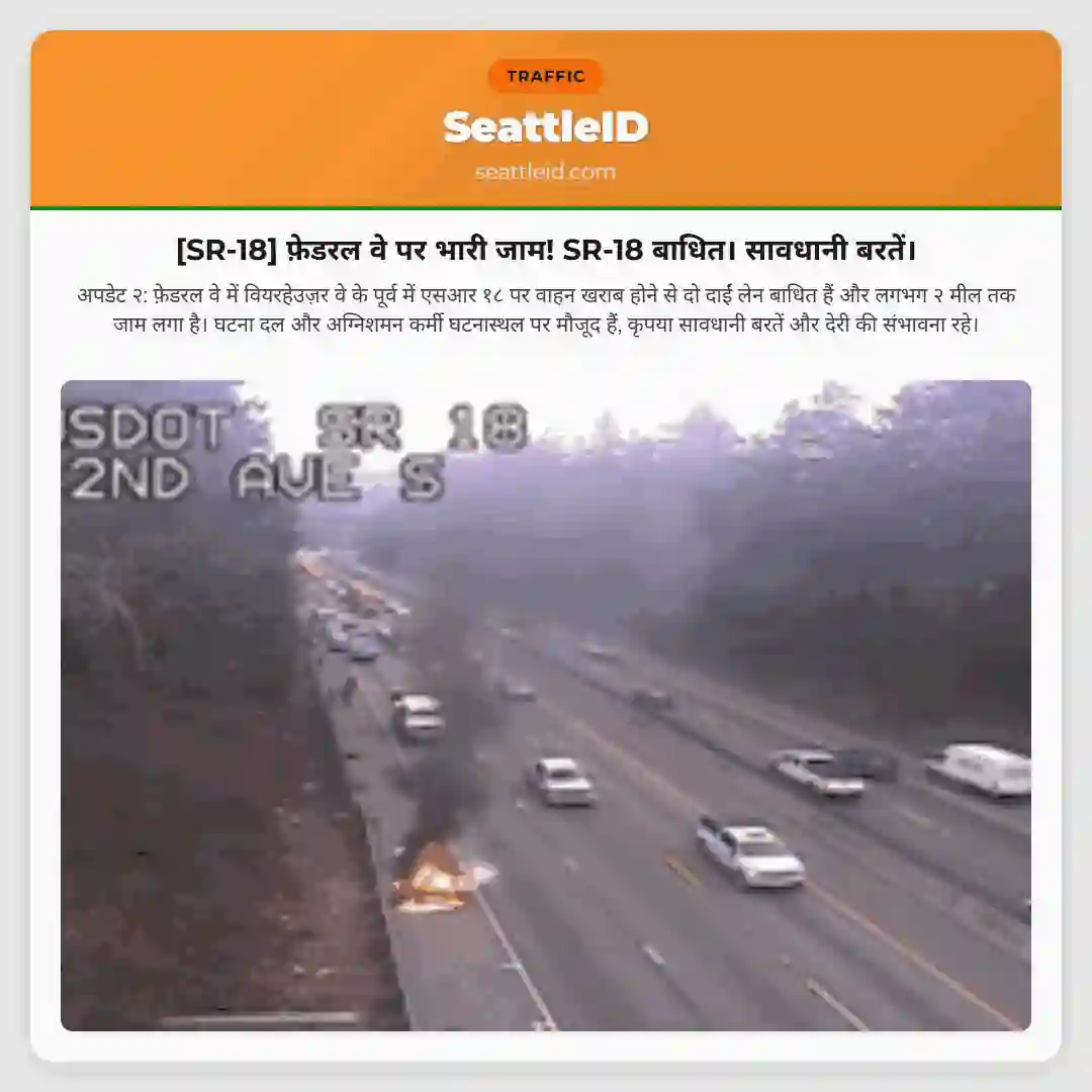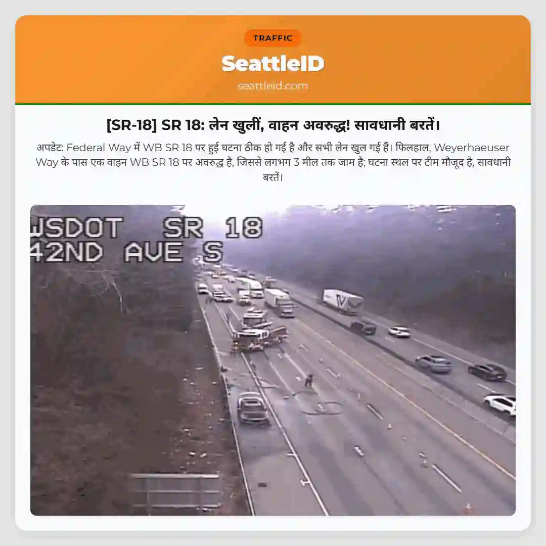 अपडेट: Federal Way में WB SR 18 पर हुई घटना ठीक हो गई है और सभी लेन खुल गई हैं। फिलहाल, Weyerhaeuser Way के पास एक वाहन WB SR 18 पर अवरुद्ध है, जिससे लगभग 3 मील तक जाम है; घटना स्थल पर टीम मौजूद है, सावधानी बरतें।