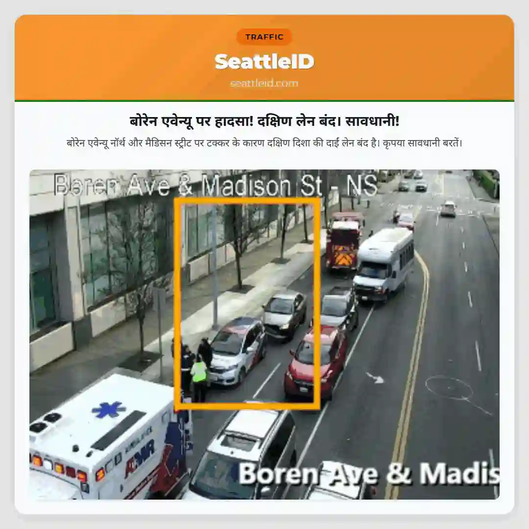 बोरेन एवेन्यू नॉर्थ और मैडिसन स्ट्रीट पर टक्कर के कारण दक्षिण दिशा की दाईं लेन बंद है। कृपया सावधानी बरतें।