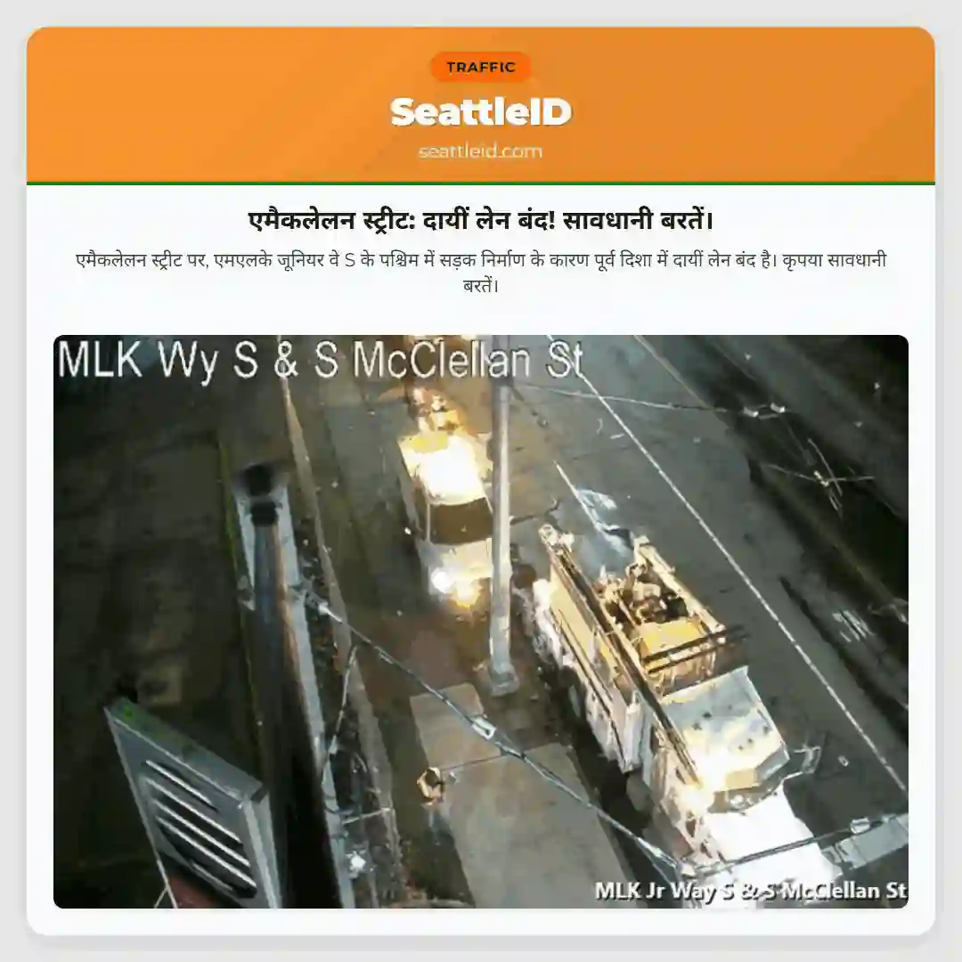 एमैकलेलन स्ट्रीट पर, एमएलके जूनियर वे S के पश्चिम में सड़क निर्माण के कारण पूर्व दिशा में दायीं लेन बंद है। कृपया सावधानी बरतें।