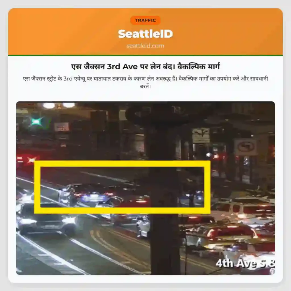 एस जैक्सन स्ट्रीट के 3rd एवेन्यू पर यातायात टकराव के कारण लेन अवरुद्ध हैं। वैकल्पिक मार्गों का उपयोग करें और सावधानी बरतें।