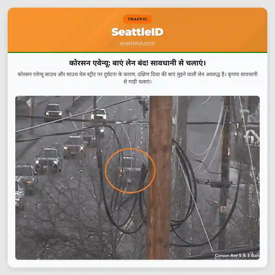कोरसन एवेन्यू साउथ और साउथ वेल स्ट्रीट पर दुर्घटना के कारण, दक्षिण दिशा की बाएं मुड़ने वाली लेन अवरुद्ध है। कृपया सावधानी से गाड़ी चलाएं।