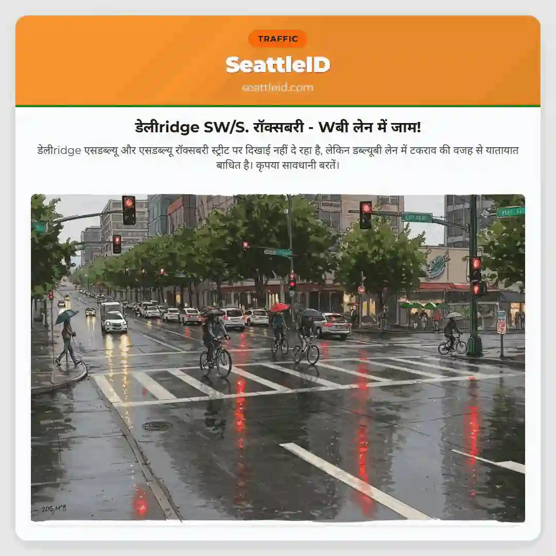 डेलीridge एसडब्ल्यू और एसडब्ल्यू रॉक्सबरी स्ट्रीट पर दिखाई नहीं दे रहा है, लेकिन डब्ल्यूबी लेन में टकराव की वजह से यातायात बाधित है। कृपया सावधानी बरतें।