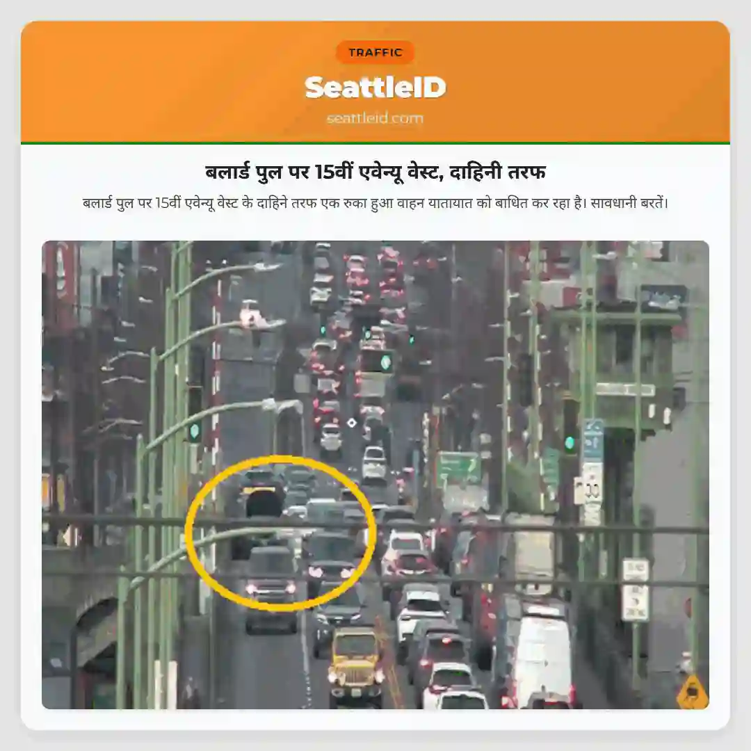 बलार्ड पुल पर 15वीं एवेन्यू वेस्ट के दाहिने तरफ एक रुका हुआ वाहन यातायात को बाधित कर रहा है। सावधानी बरतें।