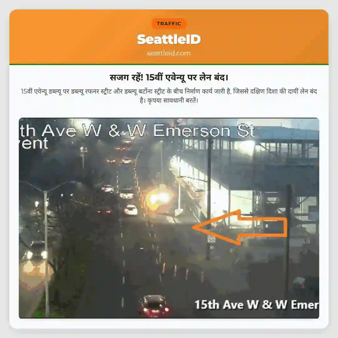 सजग रहें! 15वीं एवेन्यू पर लेन बंद।