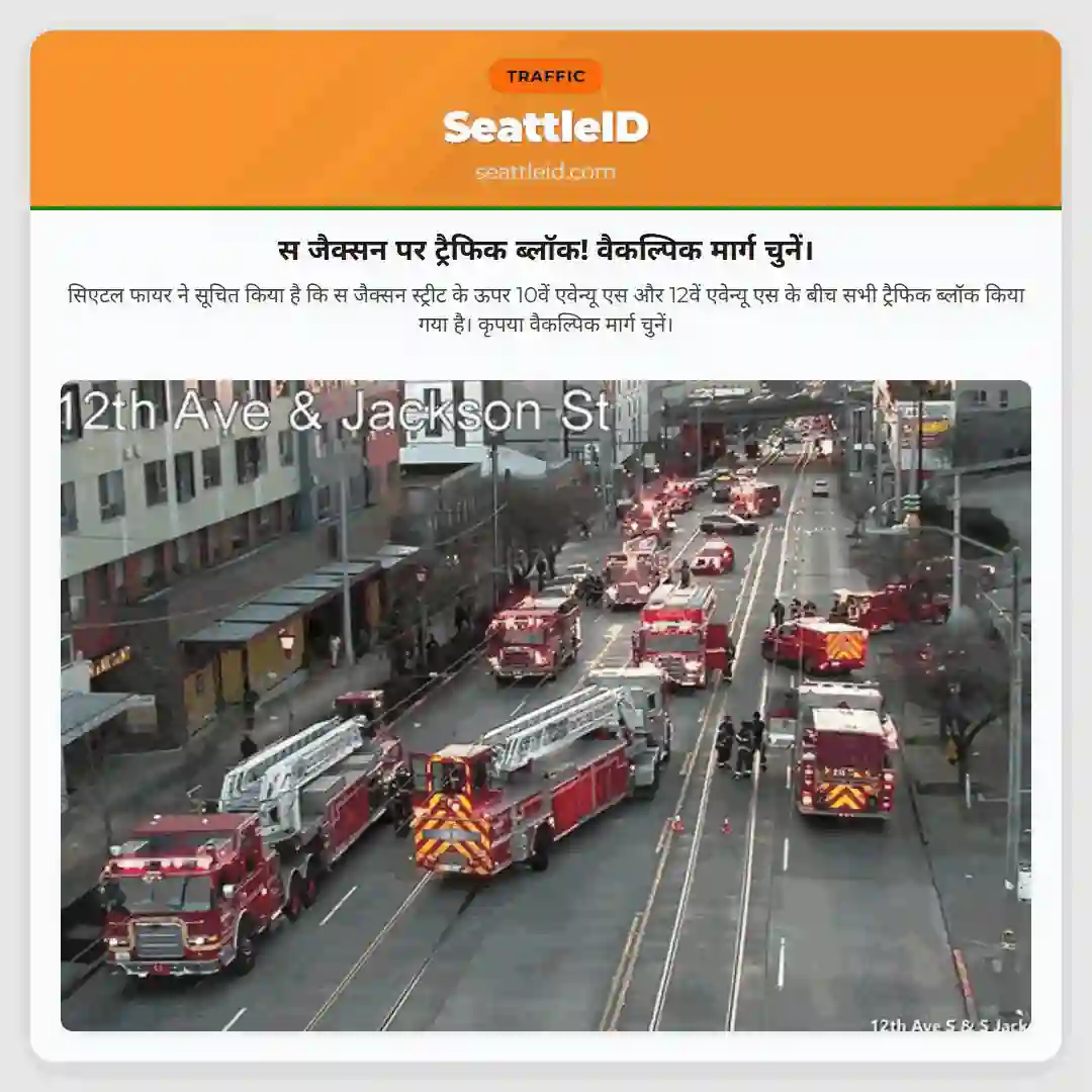सिएटल फायर ने सूचित किया है कि स जैक्सन स्ट्रीट के ऊपर 10वें एवेन्यू एस और 12वें एवेन्यू एस के बीच सभी ट्रैफिक ब्लॉक किया गया है। कृपया वैकल्पिक मार्ग चुनें।