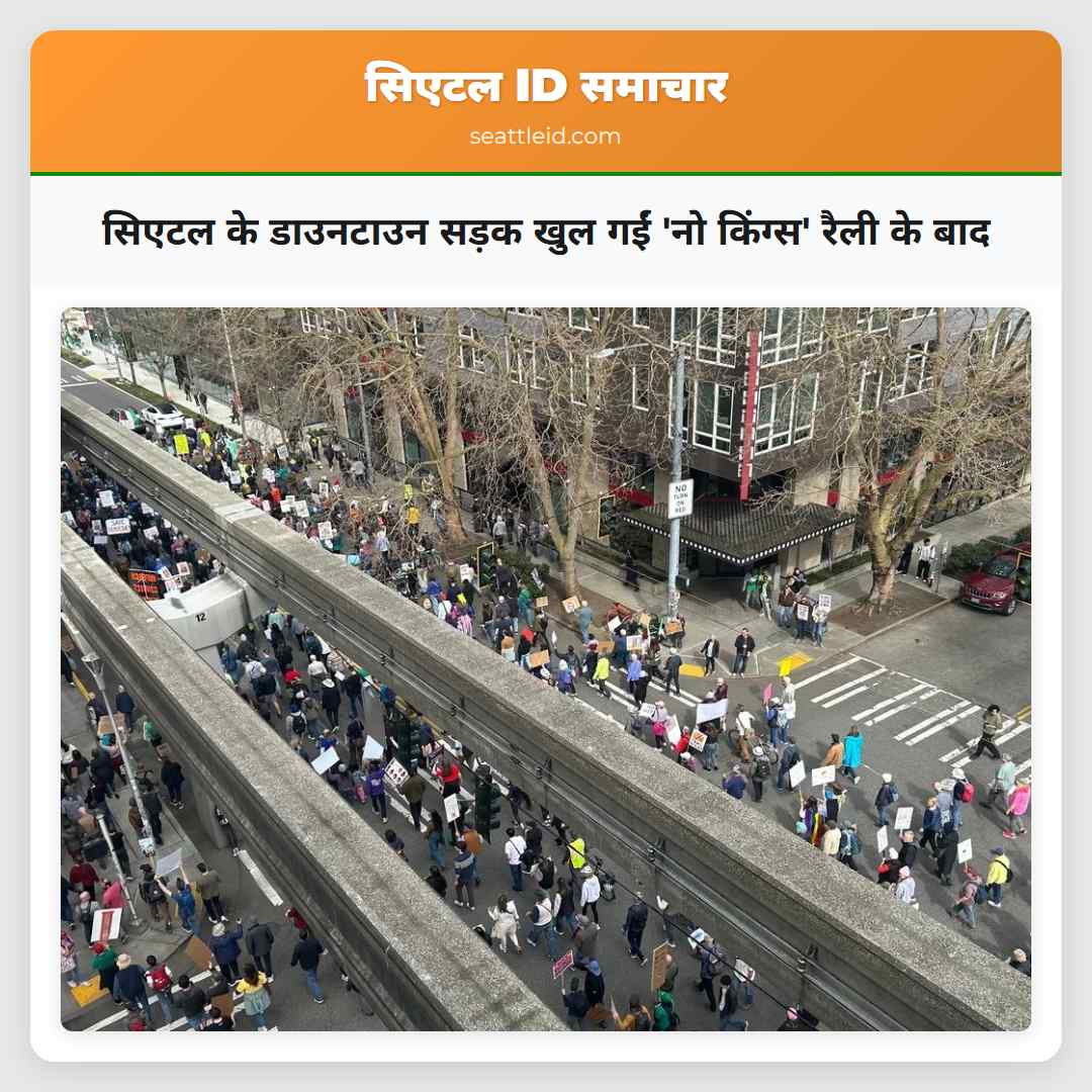 सिएटल में शनिवार को विभिन्न इलाकों में बहुत ज्यादा ट्रैफिक के कारण यातायात बाधित हुआ. इस दौरान हजारों लोग ‘नो किंग्स’ प्रदर्शन के लिए मार्च करते हुए एकत्र हो गए. शहर के विभिन्ज हिस्सों में रोड बंद हो गई. एक बड़ा जमावड़ा कैपिटल हिल के ऐतिहासिक कैल एंडरसन पार्क में हुआ. जहां लोग चले गए तो ब्रॉडवे सड़क बंद हो गई. कैपिटल हिल के मुख्य सड़क के उत्तर और दक्षिण दिशा में एस्ट ह्वील स्ट्रीट से एस्ट पाइक स्ट्रीट के बीच बाधा पड़ी.