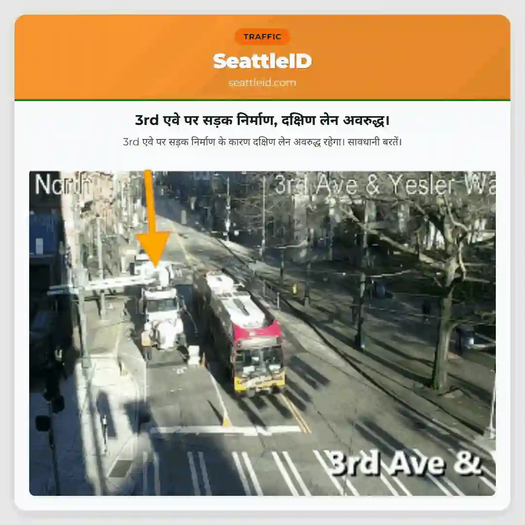 24/01/2026 09:30 Seattle traffic 3rd एवे पर सड़क निर्माण, दक्षिण लेन अवरुद्ध। 3rd एवे पर सड़क निर्माण, दक्षिण लेन अवरुद्ध। सतर्क रहें। 3rd एवे पर सड़क निर्माण के कारण दक्षिण लेन अवरुद्ध रहेगा। सावधानी बरतें। ताजा खबर [I-90] I-90 eastbound बंद! W Mercer Way के पास टक्कर। [This W-Rk Has] कार्य पुनर्निर्धारित! 27 जनवरी, सुबह 8:30-3:30 [SR-167 NB] SR-167 पर वाहन अवरुद्ध, S 212 St उत्तर में (MP 23) [SR-167] उत्तरी SR167 पर दुर्घटना! बायीं लेन बंद। सावधानी वैलिंगफर्ड/४५वीं – सिग्नल खराब! सावधानी बरतें। [Seattle-Bainbridge] समुद्रबीआई – वैनचेटी सेवा पुनः शुरू! जहाज #1