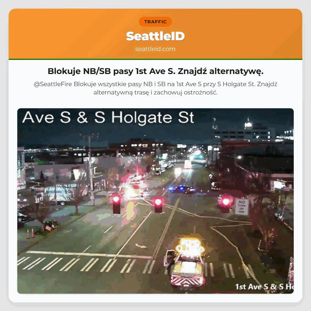 @SeattleFire Blokuje wszystkie pasy NB i SB na 1st Ave S przy S Holgate St. Znajdź alternatywną trasę i zachowuj ostrożność.