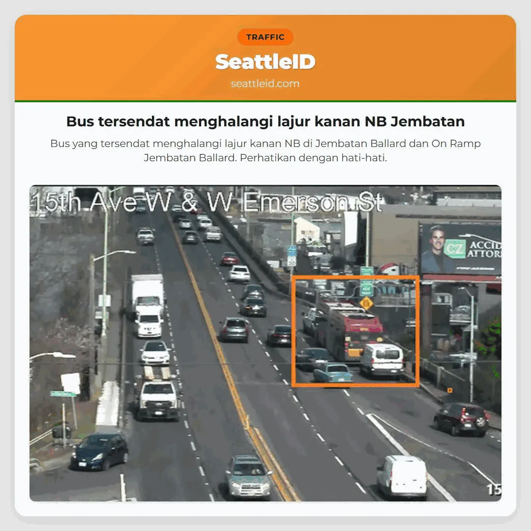 Bus yang tersendat menghalangi lajur kanan NB di Jembatan Ballard dan On Ramp Jembatan Ballard. Perhatikan dengan hati-hati.