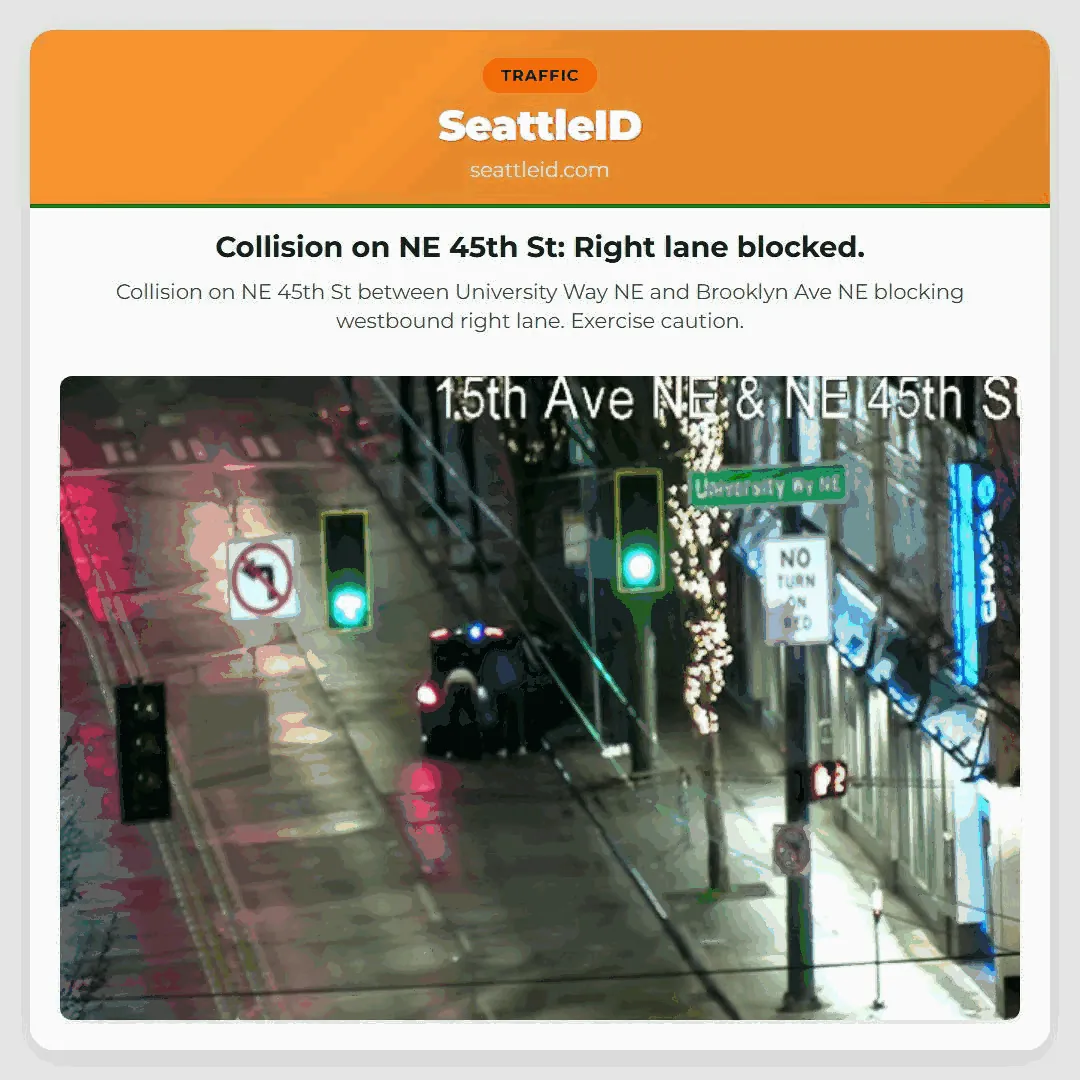 Collision on NE 45th St between University Way NE and Brooklyn Ave NE blocking westbound right lane. Exercise caution.