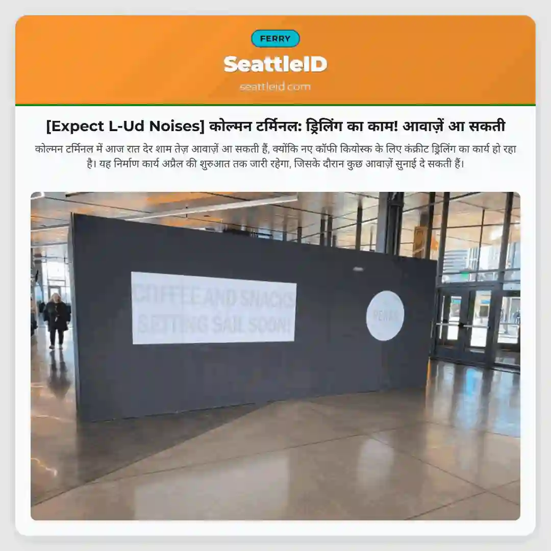 कोल्मन टर्मिनल में आज रात देर शाम तेज़ आवाज़ें आ सकती हैं, क्योंकि नए कॉफी कियोस्क के लिए कंक्रीट ड्रिलिंग का कार्य हो रहा है। यह निर्माण कार्य अप्रैल की शुरुआत तक जारी रहेगा, जिसके दौरान कुछ आवाज़ें सुनाई दे सकती हैं।