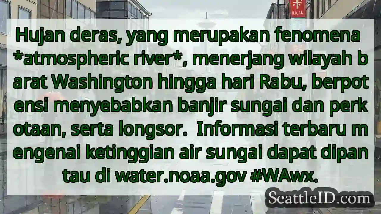 Hujan deras, yang merupakan fenomena *atmospheric river*, menerjang wilayah barat Washington hingga hari Rabu, berpotensi menyebabkan banjir sungai dan perkotaan, serta longsor. Informasi terbaru mengenai ketinggian air sungai dapat dipantau di water.noaa.gov #WAwx.