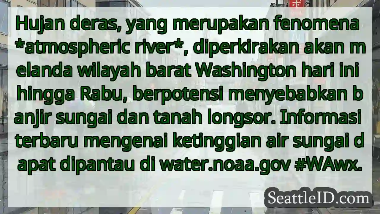 Hujan deras, yang merupakan fenomena *atmospheric river*, diperkirakan akan melanda wilayah barat Washington hari ini hingga Rabu, berpotensi menyebabkan banjir sungai dan tanah longsor. Informasi terbaru mengenai ketinggian air sungai dapat dipantau di water.noaa.gov #WAwx.