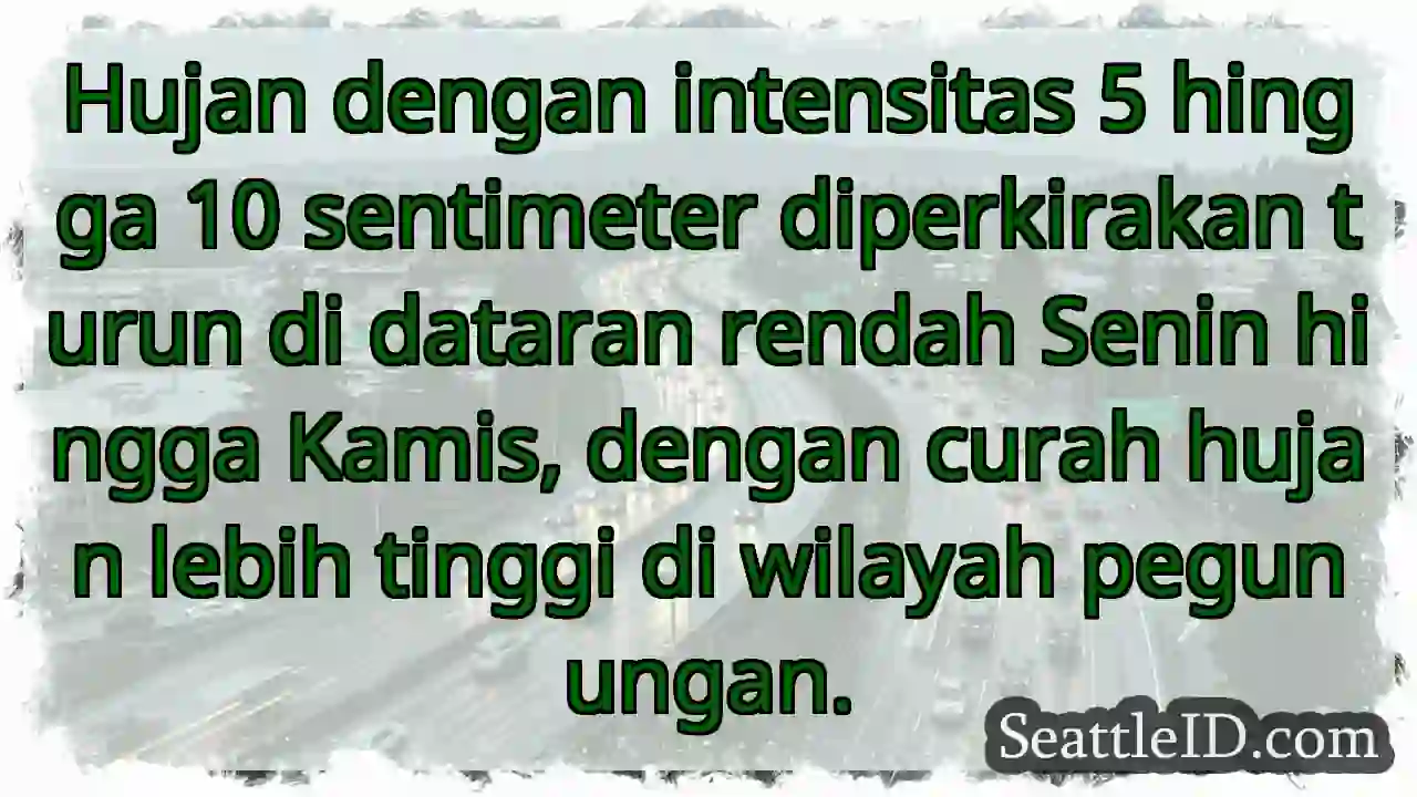 Hujan dengan intensitas 5 hingga 10 sentimeter diperkirakan turun di dataran rendah Senin hingga Kamis, dengan curah hujan lebih tinggi di wilayah pegunungan.