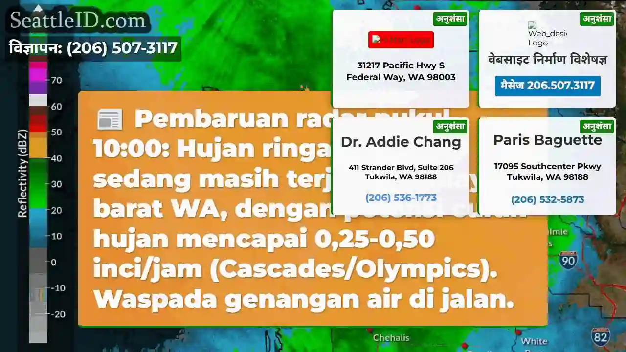Pembaruan radar pukul 10:00: Hujan ringan hingga sedang masih terjadi di wilayah barat WA, dengan potensi curah hujan mencapai 0,25-0,50 inci/jam (Cascades/Olympics). Waspada genangan air di jalan.