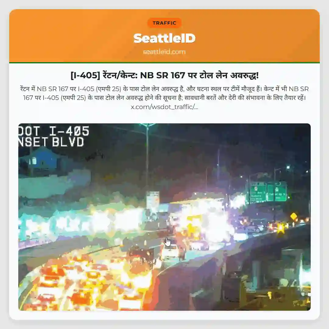 रेंटन में NB SR 167 पर I-405 (एमपी 25) के पास टोल लेन अवरुद्ध है, और घटना स्थल पर टीमें मौजूद हैं। केन्ट में भी NB SR 167 पर I-405 (एमपी 25) के पास टोल लेन अवरुद्ध होने की सूचना है; सावधानी बरतें और देरी की संभावना के लिए तैयार रहें। x.com/wsdot_traffic/…