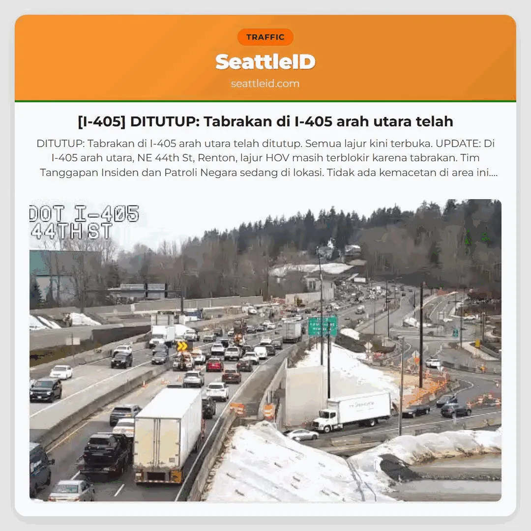 DITUTUP: Tabrakan di I-405 arah utara telah ditutup. Semua lajur kini terbuka. UPDATE: Di I-405 arah utara, NE 44th St, Renton, lajur HOV masih terblokir karena tabrakan. Tim Tanggapan Insiden dan Patroli Negara sedang di lokasi. Tidak ada kemacetan di area ini. x.com/wsdot_traffic/…