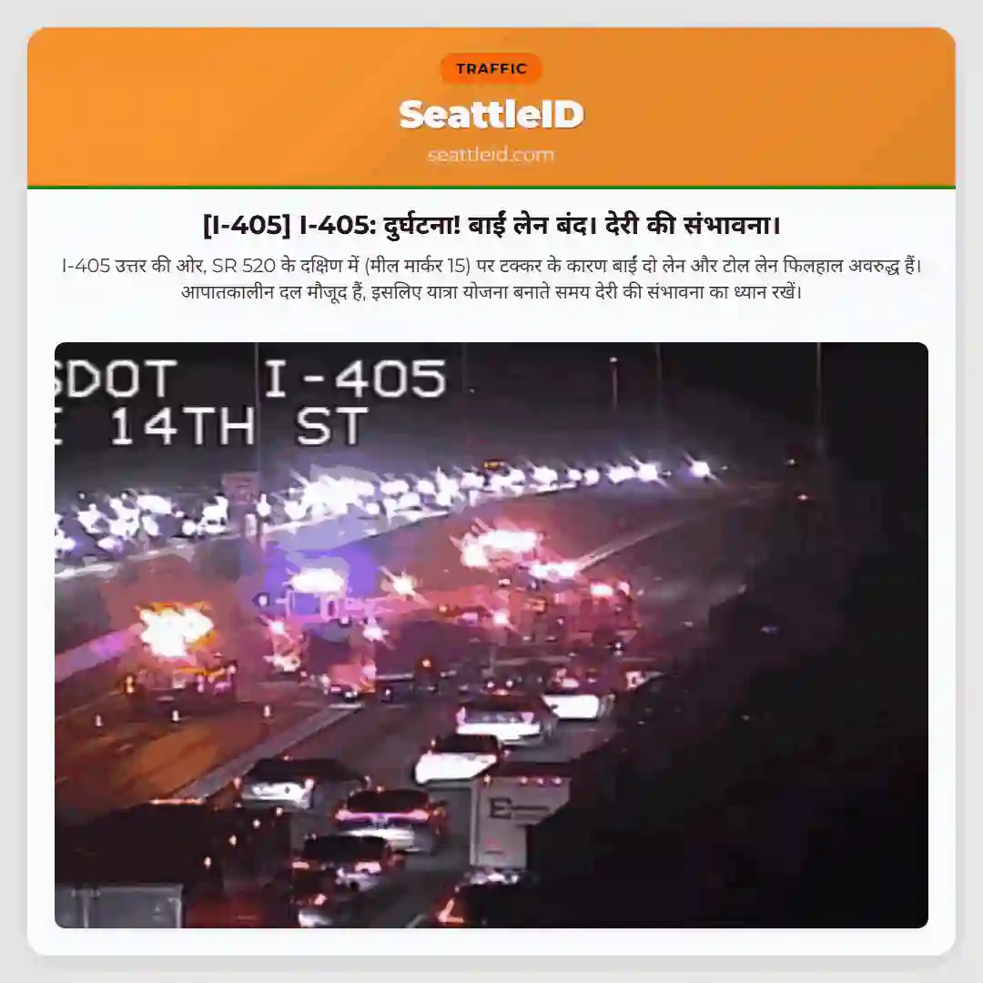 I-405 उत्तर की ओर, SR 520 के दक्षिण में (मील मार्कर 15) पर टक्कर के कारण बाईं दो लेन और टोल लेन फिलहाल अवरुद्ध हैं। आपातकालीन दल मौजूद हैं, इसलिए यात्रा योजना बनाते समय देरी की संभावना का ध्यान रखें।