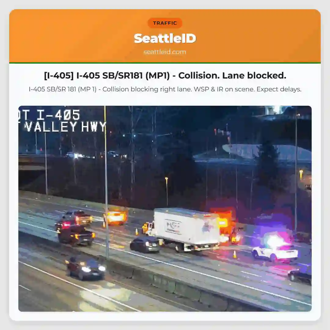 27/01/2026 07:22 Seattle traffic [I-405] I-405 SB/SR181 (MP1) – Collision. Lane blocked. I-405 SB/SR181 (MP1) – Collision. Lane blocked. WSP/IR. I-405 SB/SR 181 (MP 1) – Collision blocking right lane. WSP & IR on scene. Expect delays. ताजा खबर [SR-202] SR 202 Blocked Near 228th Ave NE (MP 12) [SR-202 EB] SR-202 EB at 228th Ave NE (MP 12) – Collision [Fauntleroy-Vashon-Southworth] फांट/वीए/एसडब्ल्यू – अपडेट – एडीए अलर्ट – कैथलमेट [I-405] साफ़: तुकविला में एसआर 181 (एमपी 1) पर एसबी [Anacortes-San Juans] Ana/SJs: Ferry suspended today (Jan 27) [I-405] I-405 SB/SR181 (MP1) – Collision. Lane blocked.