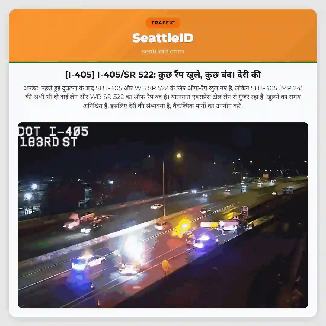 अपडेट: पहले हुई दुर्घटना के बाद SB I-405 और WB SR 522 के लिए ऑफ-रैंप खुल गए हैं, लेकिन SB I-405 (MP 24) की अभी भी दो दाईं लेन और WB SR 522 का ऑफ-रैंप बंद हैं। यातायात एक्सप्रेस टोल लेन से गुजर रहा है, खुलने का समय अनिश्चित है, इसलिए देरी की संभावना है; वैकल्पिक मार्गों का उपयोग करें।