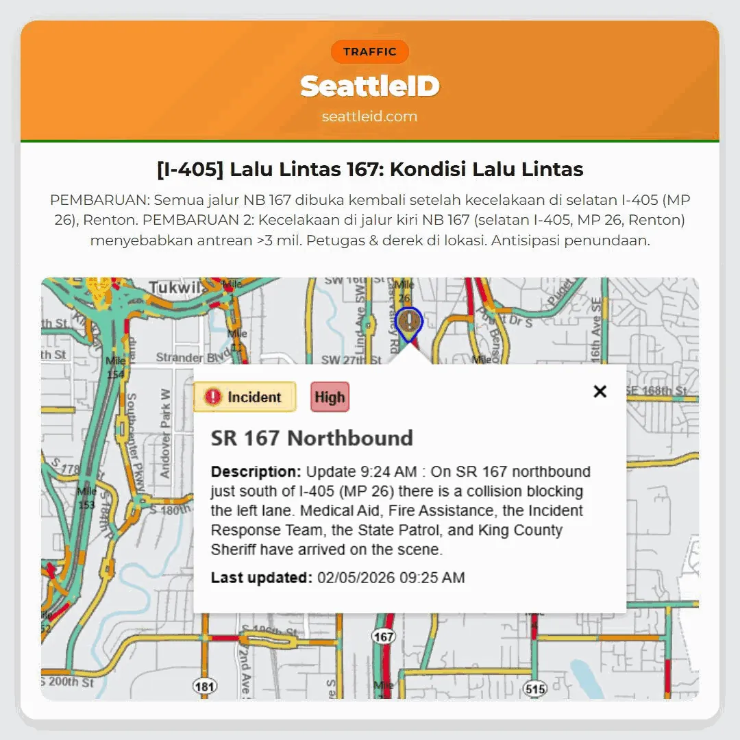 PEMBARUAN: Semua jalur NB 167 dibuka kembali setelah kecelakaan di selatan I-405 (MP 26), Renton. PEMBARUAN 2: Kecelakaan di jalur kiri NB 167 (selatan I-405, MP 26, Renton) menyebabkan antrean >3 mil. Petugas & derek di lokasi. Antisipasi penundaan.