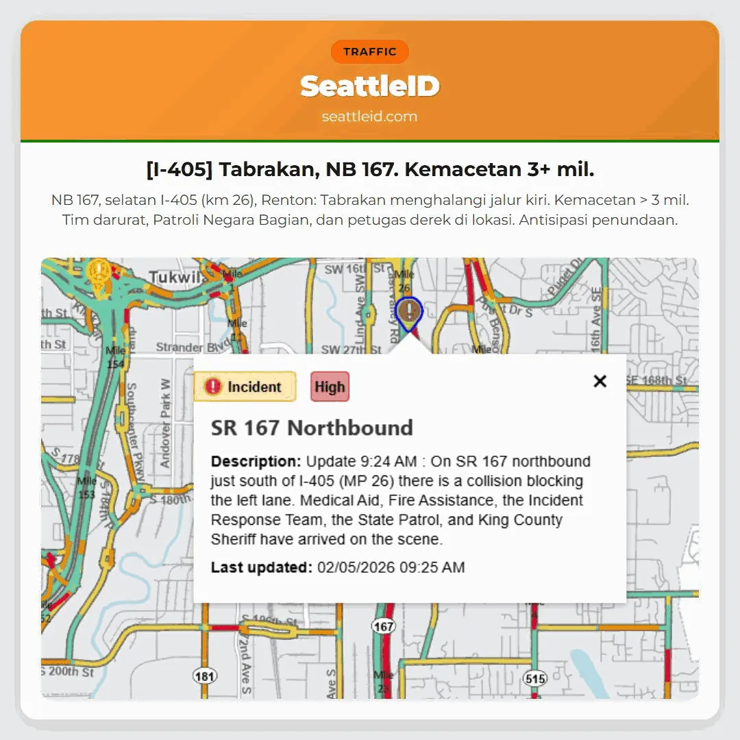 NB 167, selatan I-405 (km 26), Renton: Tabrakan menghalangi jalur kiri. Kemacetan > 3 mil. Tim darurat, Patroli Negara Bagian, dan petugas derek di lokasi. Antisipasi penundaan.