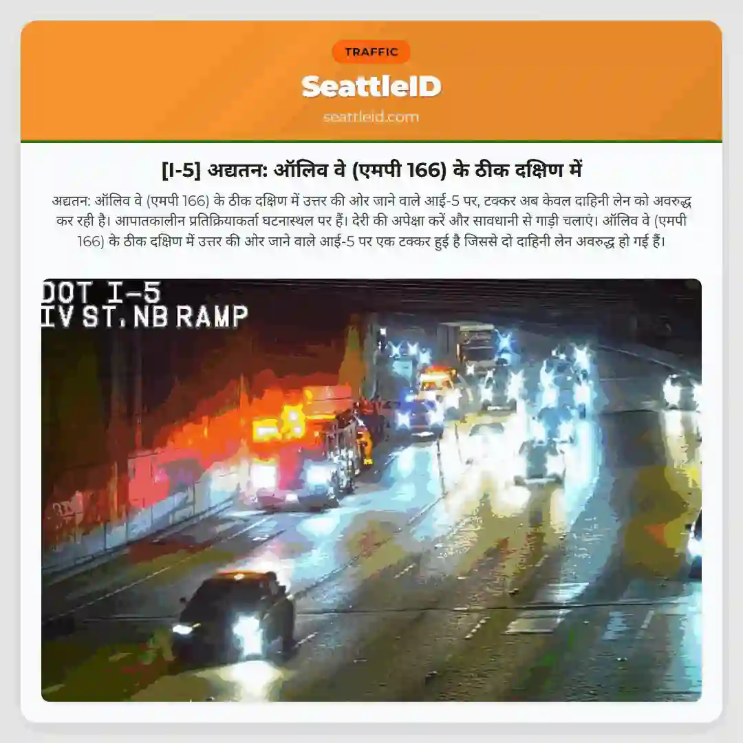 अद्यतन: ऑलिव वे (एमपी 166) के ठीक दक्षिण में उत्तर की ओर जाने वाले आई-5 पर, टक्कर अब केवल दाहिनी लेन को अवरुद्ध कर रही है।