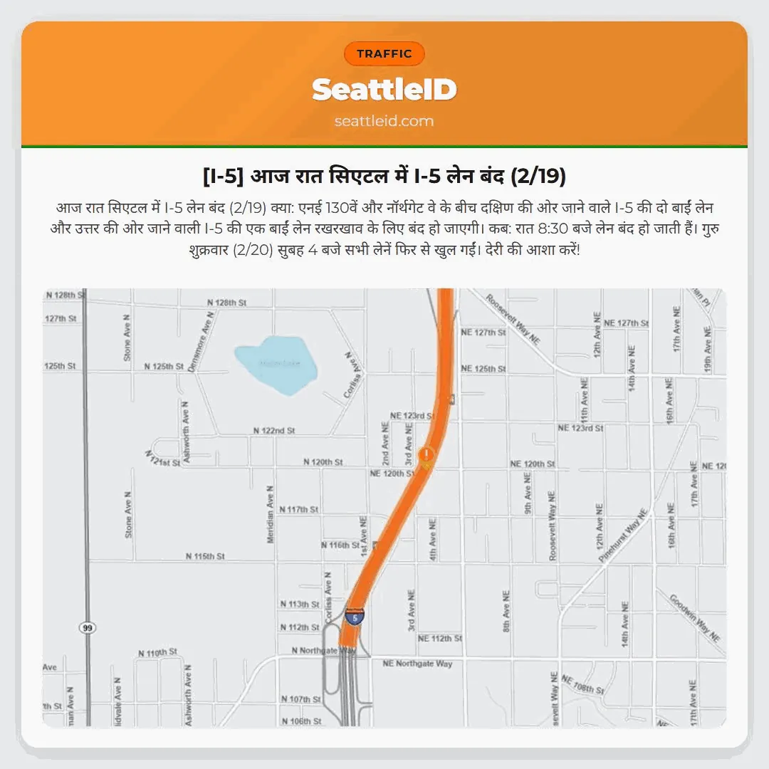 क्या: एनई 130वें और नॉर्थगेट वे के बीच दक्षिण की ओर जाने वाले I-5 की दो बाईं लेन और उत्तर की ओर जाने वाली I-5 की एक बाईं लेन रखरखाव के लिए बंद हो जाएगी।