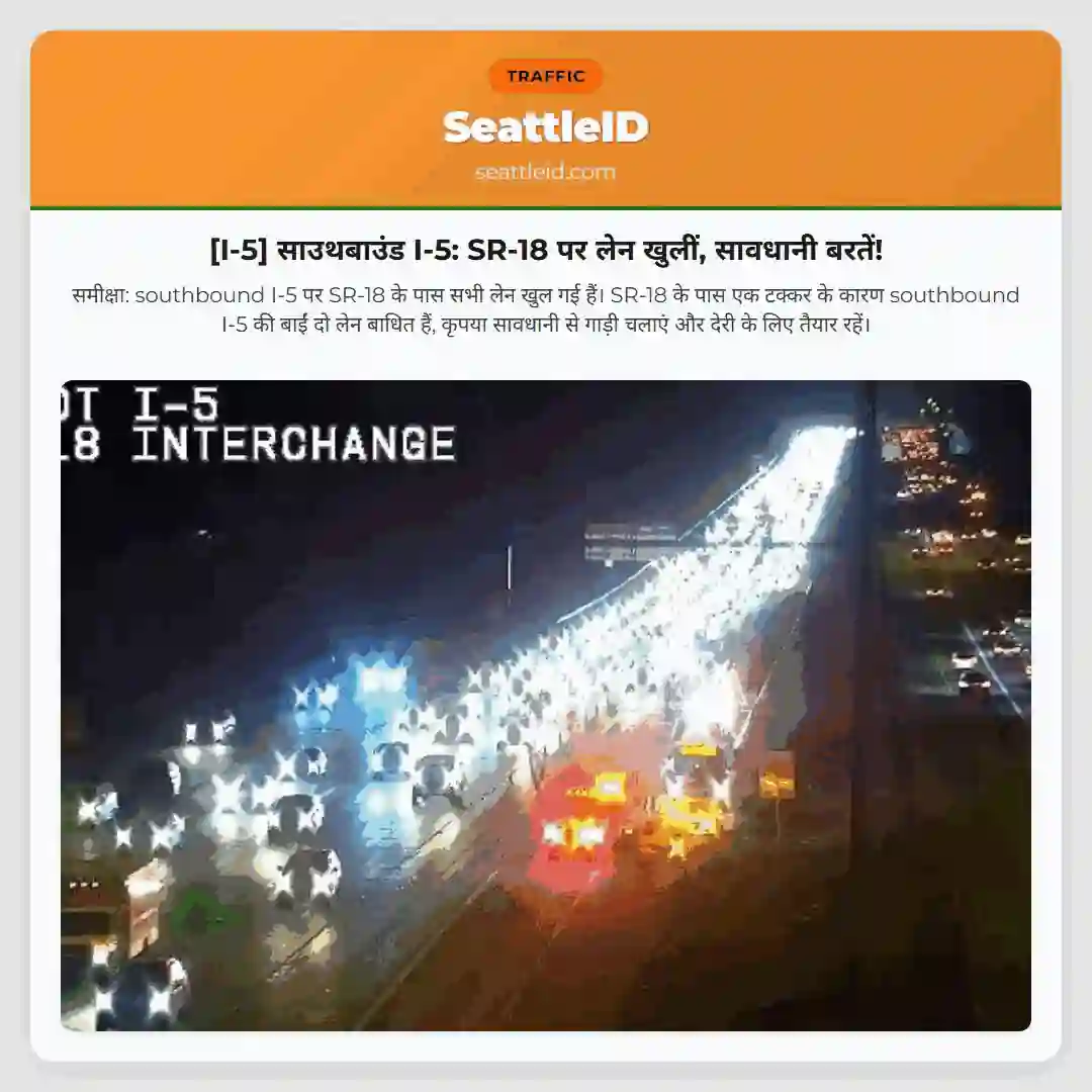 [I-5] साउथबाउंड I-5: SR-18 पर लेन खुलीं, सावधानी बरतें!
