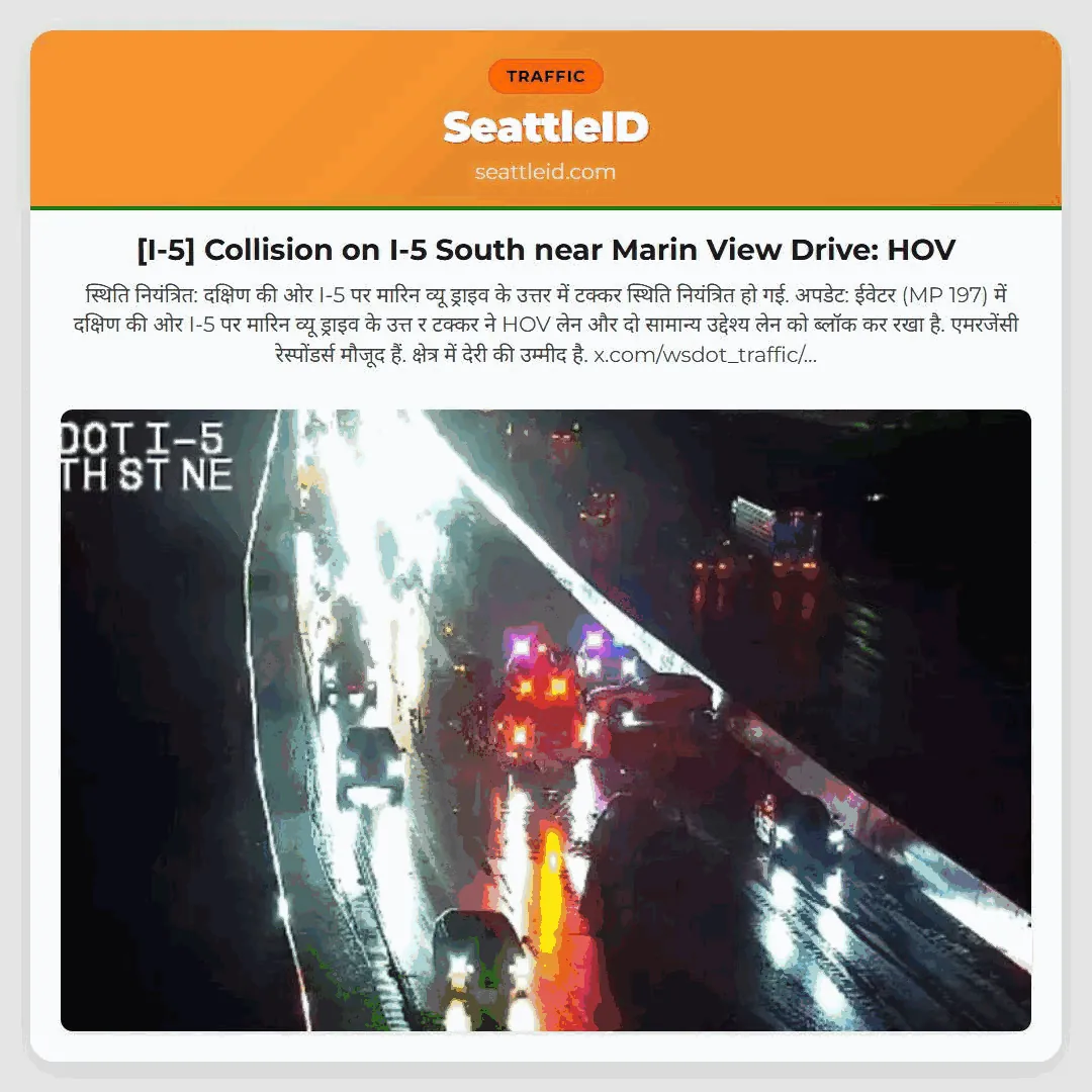 स्थिति नियंत्रित: दक्षिण की ओर I-5 पर मारिन व्यू ड्राइव के उत्तर में टक्कर स्थिति नियंत्रित हो गई. अपडेट: ईवेटर (MP 197) में दक्षिण की ओर I-5 पर मारिन व्यू ड्राइव के उत्त र टक्कर ने HOV लेन और दो सामान्य उद्देश्य लेन को ब्लॉक कर रखा है. एमरजेंसी रेस्पोंडर्स मौजूद हैं. क्षेत्र में देरी की उम्मीद है. x.com/wsdot_traffic/…
