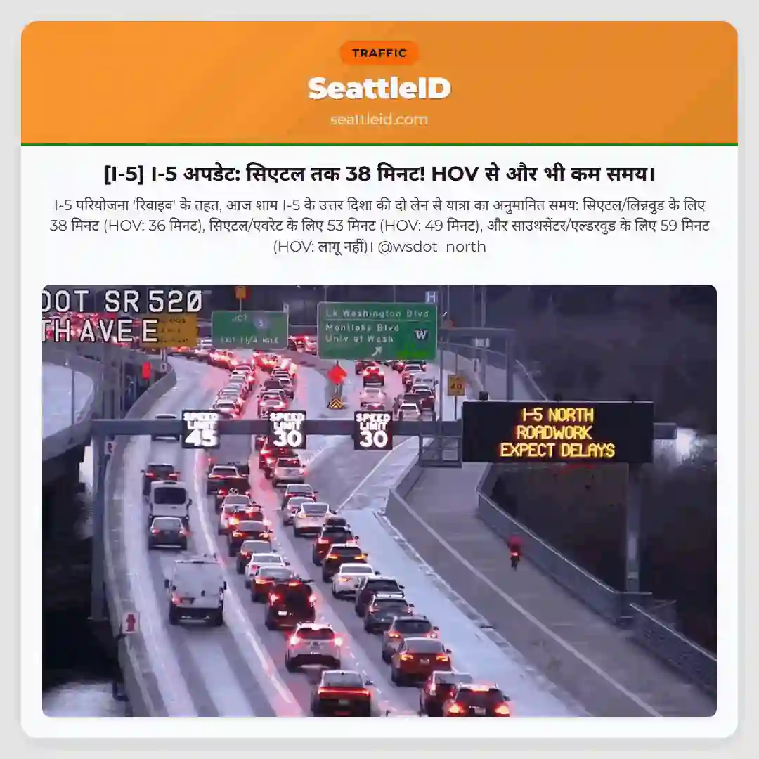 I-5 परियोजना ‘रिवाइव’ के तहत, आज शाम I-5 के उत्तर दिशा की दो लेन से यात्रा का अनुमानित समय: सिएटल/लिन्नवुड के लिए 38 मिनट (HOV: 36 मिनट), सिएटल/एवरेट के लिए 53 मिनट (HOV: 49 मिनट), और साउथसेंटर/एल्डरवुड के लिए 59 मिनट (HOV: लागू नहीं)। @wsdot_north