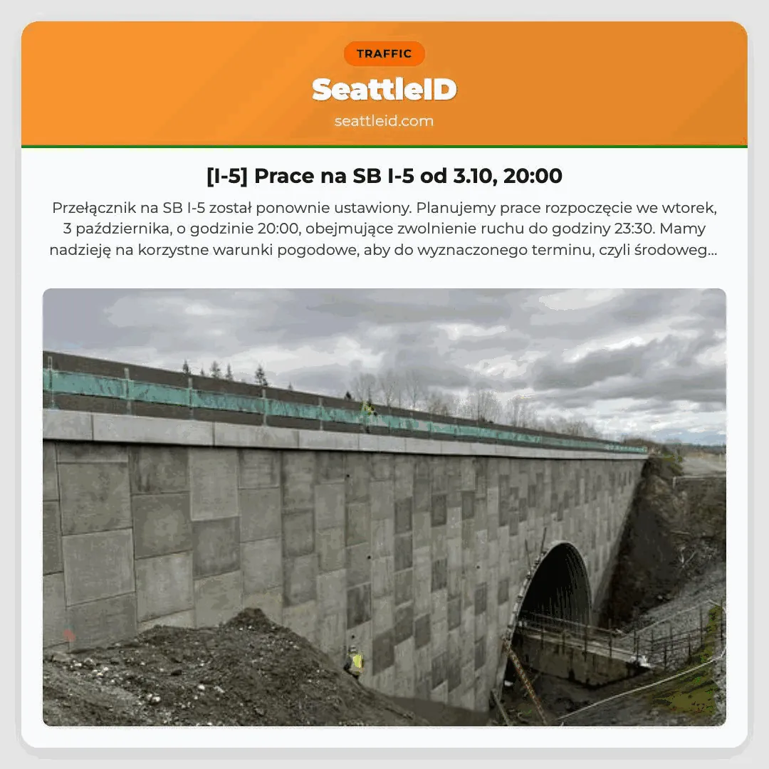 Przełącznik na SB I-5 został ponownie ustawiony. Planujemy prace rozpoczęcie we wtorek, 3 października, o godzinie 20:00, obejmujące zwolnienie ruchu do godziny 23:30. Mamy nadzieję na korzystne warunki pogodowe, aby do wyznaczonego terminu, czyli środowego, 11 października, przed południem, przywrócić normalny układ na trzech pasach SB I-5, jak to planowane jest przy Secret Creek (MP 212).
