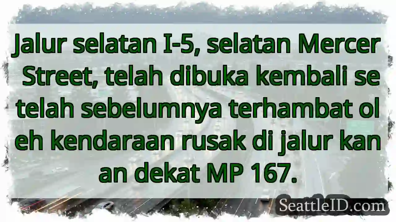 Jalur selatan I-5, selatan Mercer Street, telah dibuka kembali setelah sebelumnya terhambat oleh kendaraan rusak di jalur kanan dekat MP 167.