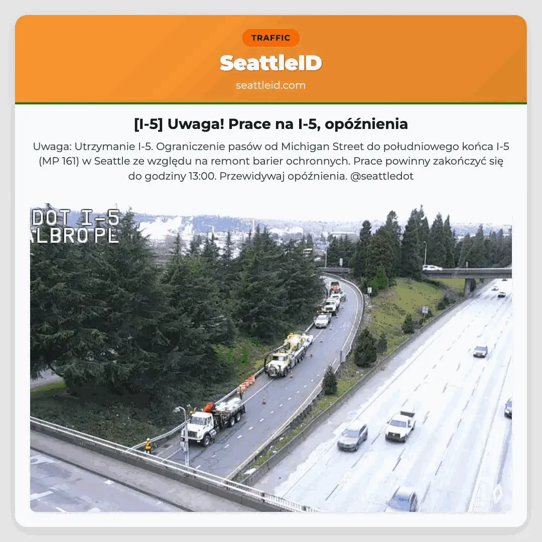 Uwaga: Utrzymanie I-5. Ograniczenie pasów od Michigan Street do południowego końca I-5 (MP 161) w Seattle ze względu na remont barier ochronnych. Prace powinny zakończyć się do godziny 13:00. Przewidywaj opóźnienia. @seattledot