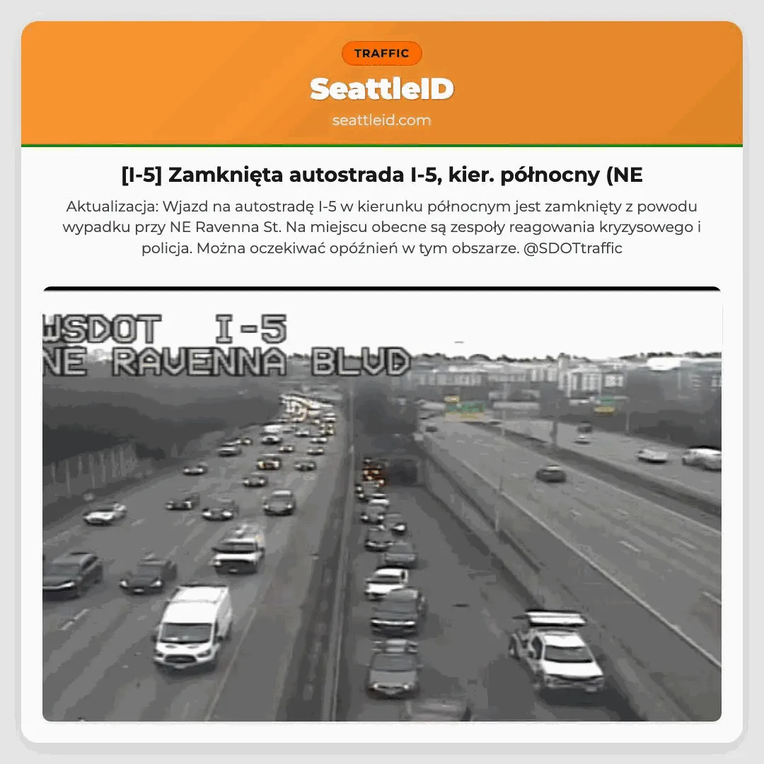 Aktualizacja: Wjazd na autostradę I-5 w kierunku północnym jest zamknięty z powodu wypadku przy NE Ravenna St. Na miejscu obecne są zespoły reagowania kryzysowego i policja. Można oczekiwać opóźnień w tym obszarze. @SDOTtraffic