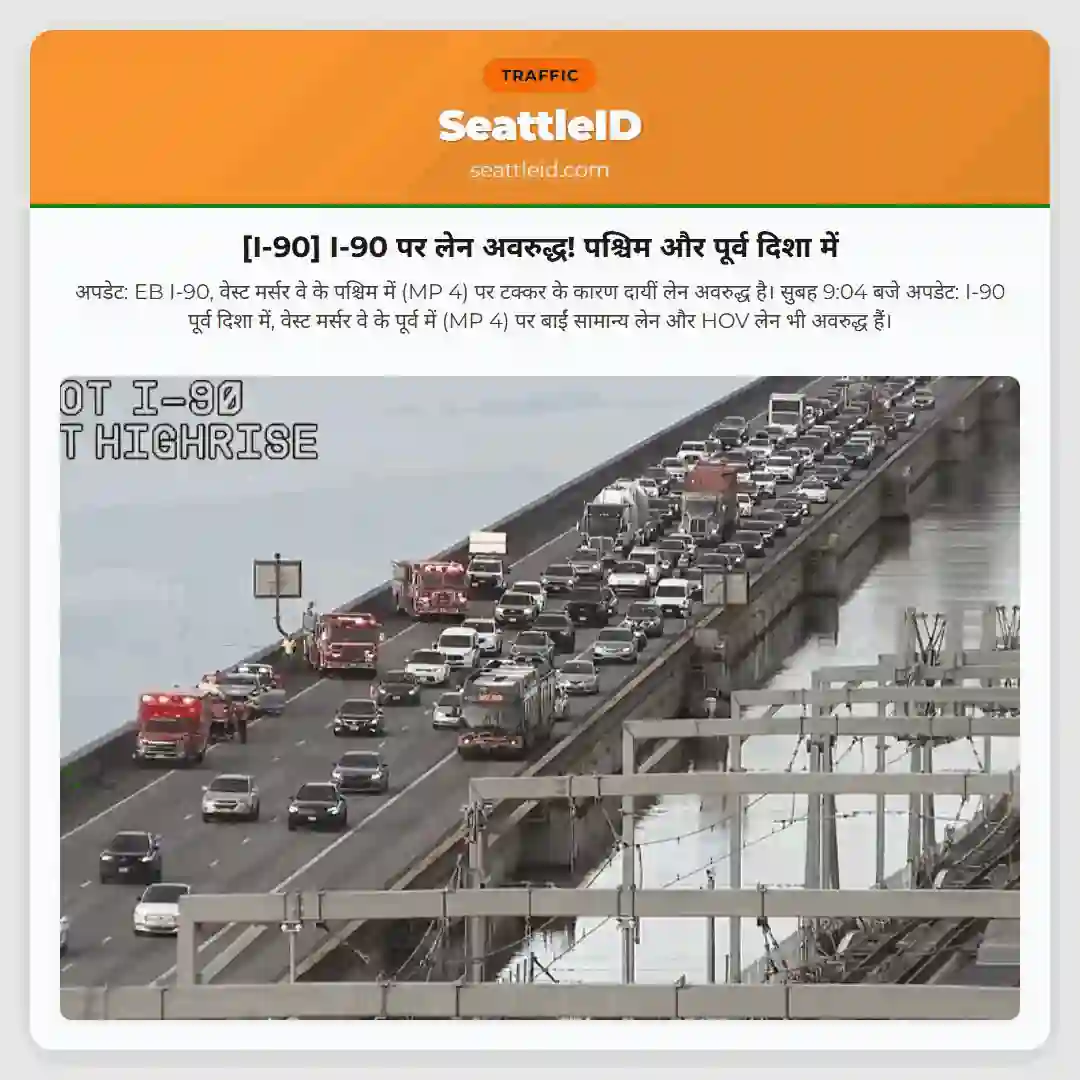 अपडेट: EB I-90, वेस्ट मर्सर वे के पश्चिम में (MP 4) पर टक्कर के कारण दायीं लेन अवरुद्ध है। सुबह 9:04 बजे अपडेट: I-90 पूर्व दिशा में, वेस्ट मर्सर वे के पूर्व में (MP 4) पर बाईं सामान्य लेन और HOV लेन भी अवरुद्ध हैं।