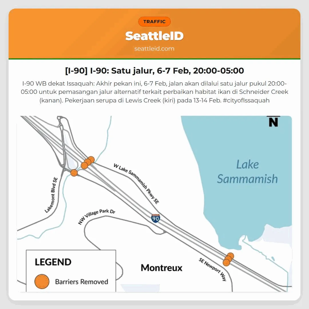 I-90 WB dekat Issaquah: Akhir pekan ini, 6-7 Feb, jalan akan dilalui satu jalur pukul 20:00-05:00 untuk pemasangan jalur alternatif terkait perbaikan habitat ikan di Schneider Creek (kanan). Pekerjaan serupa di Lewis Creek (kiri) pada 13-14 Feb. #cityofIssaquah