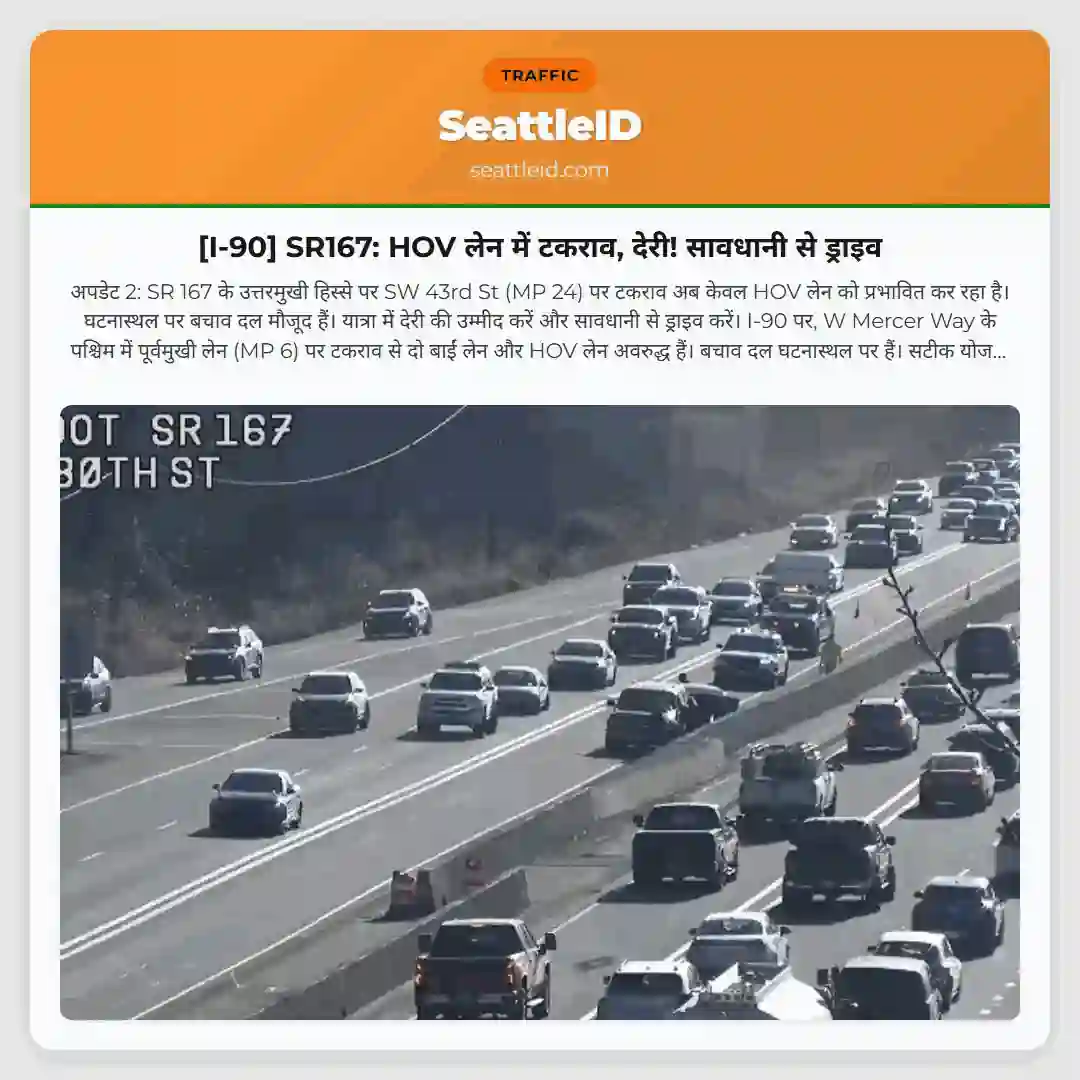 SR167: HOV लेन में टकराव, देरी! सावधानी से ड्राइव करें।