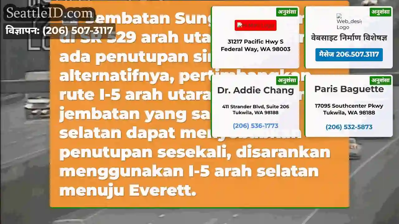 Jembatan Sungai Snohomish di SR 529 arah utara mungkin ada penutupan singkat; alternatifnya, pertimbangkan rute I-5 arah utara. Perbaikan di jembatan yang sama arah selatan dapat menyebabkan penutupan sesekali, disarankan menggunakan I-5 arah selatan menuju Everett.