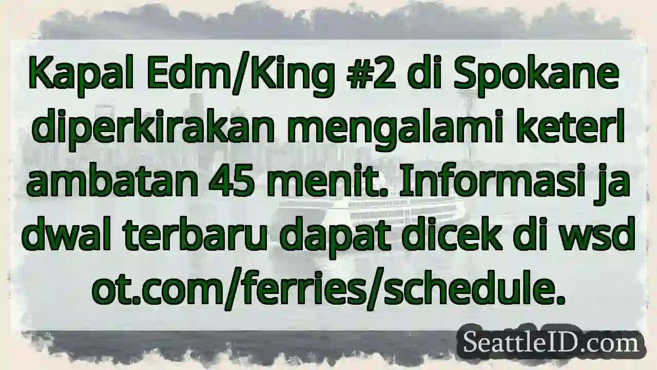 Kapal Edm/King #2 di Spokane diperkirakan mengalami keterlambatan 45 menit. Informasi jadwal terbaru dapat dicek di wsdot.com/ferries/schedule.