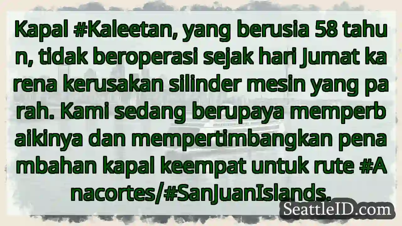 Kapal #Kaleetan, yang berusia 58 tahun, tidak beroperasi sejak hari Jumat karena kerusakan silinder mesin yang parah. Kami sedang berupaya memperbaikinya dan mempertimbangkan penambahan kapal keempat untuk rute #Anacortes/#SanJuanIslands.