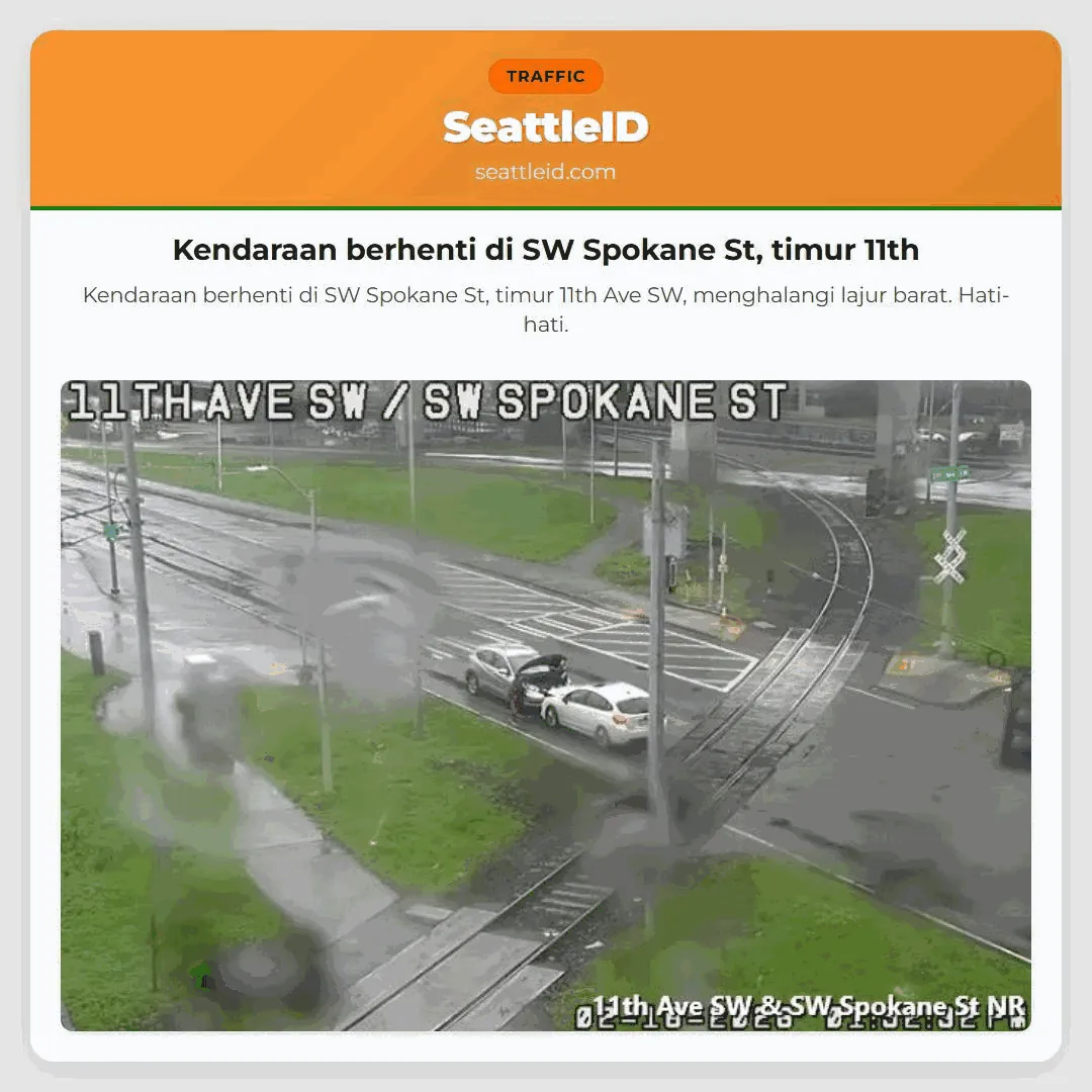 16/02/2026 14:02 Seattle traffic Kendaraan berhenti di SW Spokane St, timur 11th Kendaraan berhenti di SW Spokane St, timur 11th Ave SW, Kendaraan berhenti di SW Spokane St, timur 11th Ave SW, menghalangi lajur barat. Hati-hati. ताजा खबर Tabrakan di James St Timur, 7th Ave menghalangi [SR-99 NB] Tabrakan di SR 99 arah utara, blokir jalur HOV Hujan akan menghasilkan campuran hujan dan salju [I-90 WB] I-90 EB off-ramp to Rainier Ave S (MP 4) block Teen injured knee in avalanche rescue, rescued by [Edmonds-Kingston] Edm/King – Kingston Terminal Status – 2-Hour
