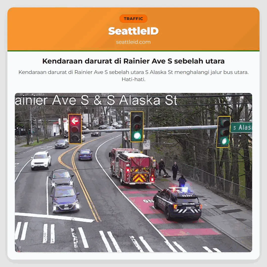 Kendaraan darurat di Rainier Ave S sebelah utara S Alaska St menghalangi jalur bus utara. Hati-hati.