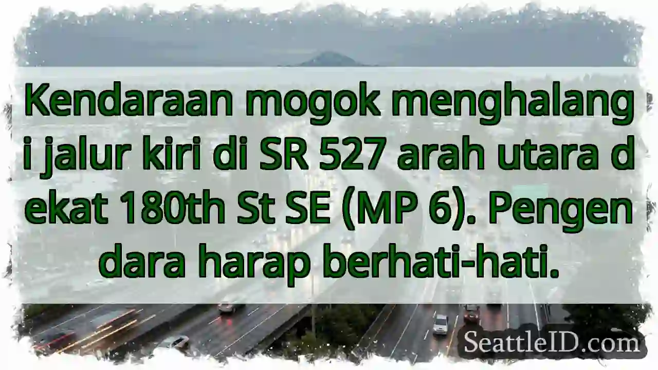 Kendaraan mogok menghalangi jalur kiri di SR 527 arah utara dekat 180th St SE (MP 6). Pengendara harap berhati-hati.