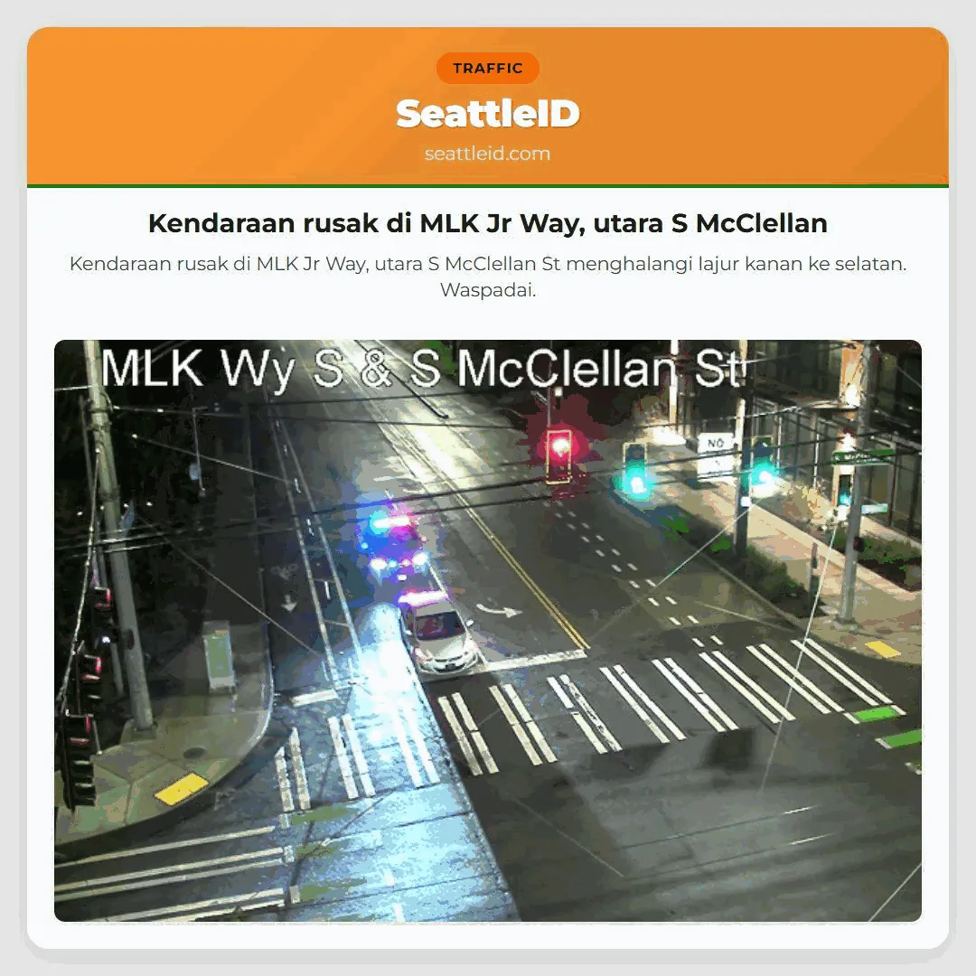 Kendaraan rusak di MLK Jr Way, utara S McClellan St menghalangi lajur kanan ke selatan. Waspadai.