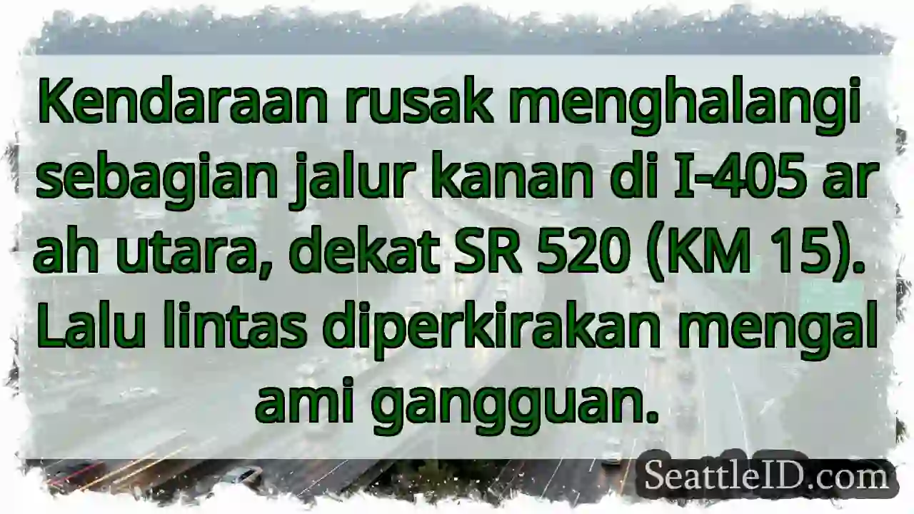 Kendaraan rusak menghalangi sebagian jalur kanan di I-405 arah utara, dekat SR 520 (KM 15). Lalu lintas diperkirakan mengalami gangguan.