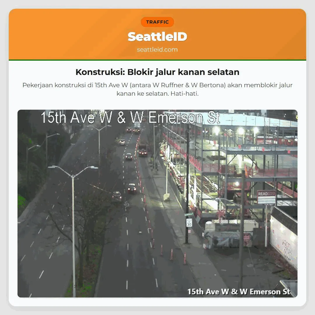 Pekerjaan konstruksi di 15th Ave W (antara W Ruffner & W Bertona) akan memblokir jalur kanan ke selatan. Hati-hati.