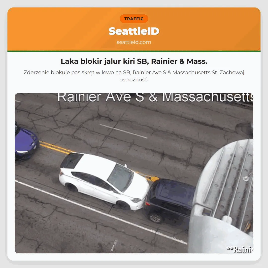04/02/2026 08:27 Seattle traffic Laka blokir jalur kiri SB, Rainier & Mass. Laka blokir jalur kiri SB, Rainier & Mass. Zderzenie blokuje pas skręt w lewo na SB, Rainier Ave S & Massachusetts St. Zachowaj ostrożność. ताजा खबर [SR-203] JEMBATAN: Lalu Lintas Bergantian Jalan Genesee ditutup (W&E). Hati-hati! [I-5] Jalan I-5 Selatan: Sudah Dibuka [Wastatepatrol Tro-Pers Are] Latihan Polisi di Kapal WSF [Mukilteo-Clinton] Mukilteo/Clinton: 1 kapal (perbaikan) AS: Panas datang! Istirahat dari dingin.